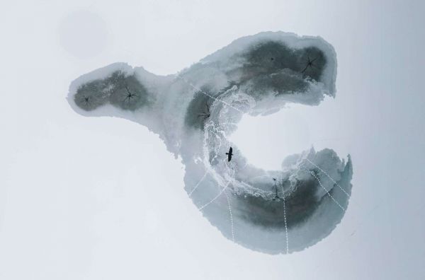Un paysage hivernal abstrait à couper le souffle où la glace a pris une forme presque extraterrestre. Un oiseau solitaire plane au-dessus de l'eau gelée, tandis que des traces subtiles d'animaux racontent une histoire de mouvement et de vie. Les teintes fraîches et les formes organiques créent une atmosphère rêveuse et sereine.