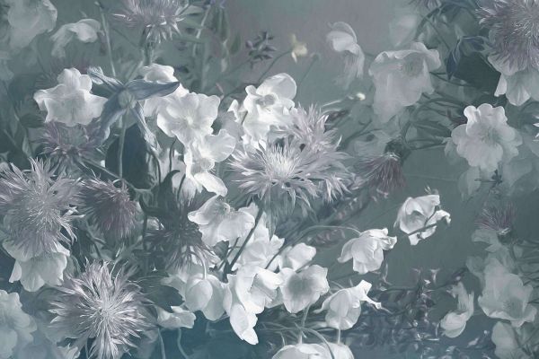Ce design raffiné dégage une élégance sereine et mystérieuse avec une palette de bleu brumeux, de vert-gris et de douces teintes pastel. Les délicates fleurs blanches et les chardons lilas semblent se fondre dans un arrière-plan rêveur, presque éthéré, créant un effet apaisant et raffiné. Les coups de pinceau subtils et les transitions de couleurs douces donnent à l'ensemble une apparence picturale, presque impressionniste, idéale pour ceux qui recherchent une touche de poésie dans l'intérieur.