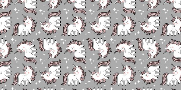 Un motif de bébés licornes blanches à la crinière rose sur un fond gris.