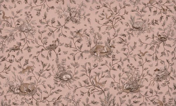 Le fond rose poudré donne à l'ensemble une apparence douce et féminine, formant un contraste magnifique avec les tons chauds de brun et de gris des feuilles et des animaux. Ce choix de couleur rend la conception particulièrement adaptée à une chambre d'enfant romantique ou à un style campagnard nostalgique, où les matériaux naturels et les tons doux déterminent l'ambiance.