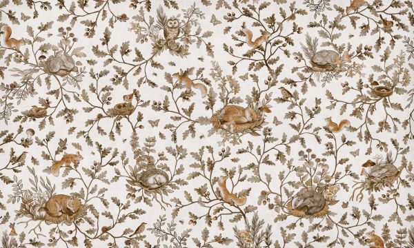 Une forêt sereine pleine de calme et de détails fins se déploie sur un fond clair, presque blanc. Entre les branches gracieuses de chênes avec des glands, des feuilles et de douces fleurs, de nombreux animaux de la forêt se nichent : des lapins dorment paisiblement sur des lits de feuilles, des écureuils grimpent joyeusement entre les branches, un hibou monte la garde et de petits oiseaux se blottissent confortablement dans leurs nids. Sur l'ensemble du motif, de petits animaux, des papillons, des champignons et des plantes en fleurs sont subtilement entrelacés.