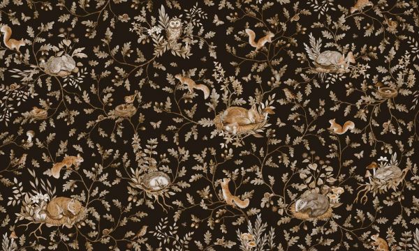 Ce design respire le silence de la forêt une fois que la nuit tombe. Sur un fond brun foncé, des branches de chêne pleines de feuilles, de glands et de fleurs s'enroulent. Entre cette forêt nocturne se nichent des lapins endormis, des écureuils curieux, des hiboux rêveurs et des oiseaux dans leurs nids douillets. Chaque animal est travaillé avec des lignes douces et des détails riches, comme s'ils étaient sortis d'un vieux livre de nature. La palette de couleurs se compose de tons chauds tels que le brun rouille, le beige sable, le crème et un subtil ocre doré. Ces couleurs contrastent magnifiquement avec le fond sombre, donnant à l'ensemble profondeur et chaleur. Cela rend le design particulièrement adapté à un intérieur classique ou vintage, mais aussi magnifique comme accent dans une chambre d'enfant chaleureuse ou un coin lecture confortable. Les animaux apportent une sensation de tendresse, de calme et de connexion avec la nature. Les illustrations regorgent de petites surprises : des papillons, des champignons, des escargots et des fleurs apparaissent entre les feuilles, ajoutant une touche de magie supplémentaire. La composition est aérée pour ne pas être écrasante, mais assez riche pour découvrir quelque chose de nouveau à chaque regard. Ce design s'épanouit magnifiquement dans des espaces où une atmosphère chaleureuse et accueillante est souhaitée. Pensez à une chambre de bébé ou d'enfant avec des meubles en bois, un tapis moelleux et un éclairage chaleureux. Également joli dans un hall de campagne, ou comme mur d'accent dans une chambre avec des tons terreux chauds et des matériaux naturels.