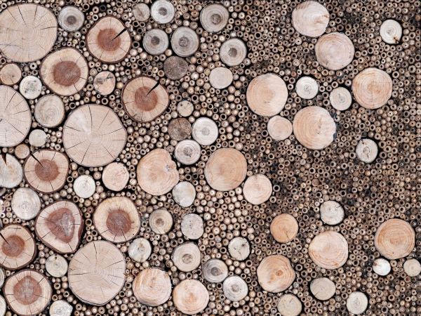 Cette composition fascinante montre un motif structuré mais organique de rondelles de bois de toutes tailles, allant des grands anneaux d'arbre aux fins segments de branches creuses. Le design est composé de matériaux naturels dans un spectre de couleurs chaudes : du sable au brun miel en passant par le noyer profond. La variation de l'épaisseur, de la texture et de la taille crée un ensemble étonnamment vivant qui est à la fois apaisant et terrestre. Ce design s'intègre parfaitement dans un intérieur rustique, scandinave ou industriel. Dans un style campagnard, il souligne le lien avec la nature et le caractère artisanal des matériaux. Associez-le à des meubles en bois robustes, des tissus en lin et de la céramique. Dans un intérieur scandinave, ce design crée des contrastes chaleureux à côté d'une palette de couleurs claire et minimaliste. Dans un intérieur industriel moderne, ce motif peut servir de contrepoids naturel aux matériaux bruts tels que le béton, l'acier et le cuir. La palette de couleurs se compose de différentes teintes de bois - beige, brun, bois grisâtre et parfois une touche de bois de cœur rougeâtre. Les cernes naturels et les veines du bois apportent une profondeur visuelle, tandis que le placement répétitif des rondelles et des tubes crée une structure tangible qui semble presque sculpturale. Idéalement applicable dans un salon, un bureau à domicile, une cuisine ou un couloir - surtout en tant que mur d'accent ou en combinaison avec une décoration naturelle. Ce design apporte une sensation de chaleur, de calme et de durabilité à la maison, et invite à se rapprocher de l'essence des matériaux.