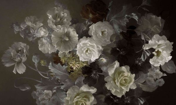Pour une finition luxueuse, des accessoires tels que des cadres dorés, des miroirs anciens et des fleurs séchées dans des teintes métalliques chaudes peuvent être ajoutés. Ce design floral intemporel fait revivre la grandeur des natures mortes historiques et constitue une magnifique base pour un intérieur élégant et stylé.