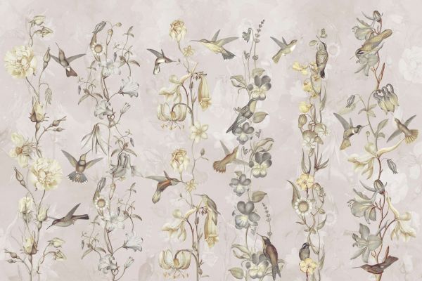 Un tableau raffiné et rêveur de colibris gracieux flottant entre des fleurs luxuriantes dans des teintes douces de crème, beige et vert-gris. Les détails subtils, dessinés à la main, et la palette de couleurs délicate créent une ambiance romantique et intemporelle, parfaite pour une atmosphère apaisante et élégante.