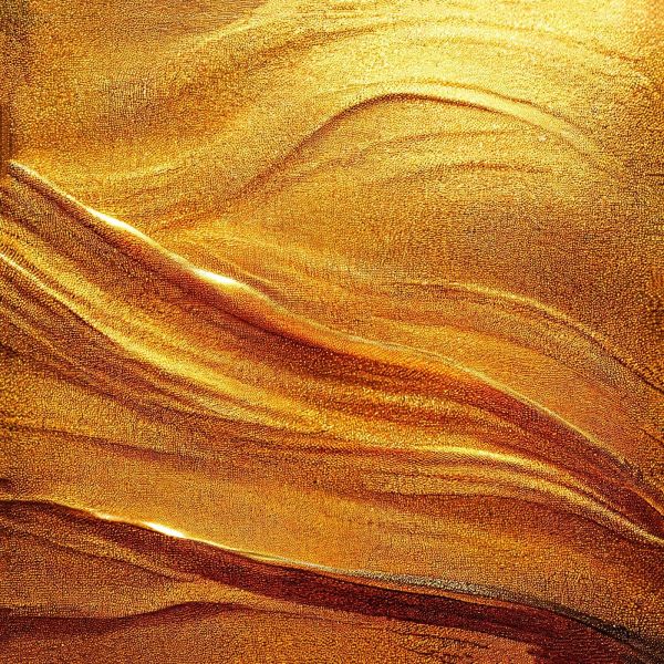 Un design abstrait dynamique avec des lignes fluides dans des tons dorés riches. La texture brillante et les ombres subtiles rappellent les dunes de sable baignées de soleil ou le métal liquide en mouvement.