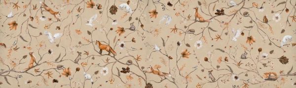 Un motif raffiné de renards, de hiboux, de lapins et d'écureuils, finement entrelacé entre des branches fines et des feuilles d'automne sur un fond beige chaleureux. Une scène douce et atmosphérique, pleine de détails et de la splendeur de la nature.