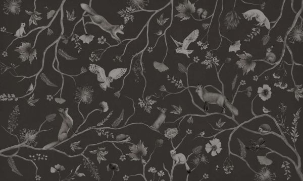 Cet design raffiné donne vie au silence de la forêt la nuit, avec une harmonieuse interaction entre les animaux et la nature dans des tons doux sur un fond noir profond et mat. Entre les lignes ramifiées et les fleurs subtiles, nous voyons des renards, des lapins, des belettes, des hérissons, des chouettes et de petits oiseaux chanteurs qui semblent presque briller sur la toile sombre. Les illustrations sont réalisées dans des nuances douces de gris, de brun et de blanc, créant un contraste subtil mais riche. La flore est détaillée mais légère, avec des feuilles fanées, des graines, des fleurs et de fines branches qui s'étirent sans effort sur la surface. Malgré l'utilisation de couleurs sombres, l'ensemble reste élégant, stylé et équilibré. Ce design s'intègre parfaitement dans un intérieur moderne chic ou scandinave sombre, où profondeur, calme et caractère se rencontrent. Pensez à des combinaisons avec des matériaux doux comme le velours, des meubles en bois foncé, de l'acier noir ou de la céramique mate. Ce design peut également faire une déclaration puissante et apaisante dans une chambre de bébé luxueuse ou un coin lecture élégant. Utilisez des accents chaleureux comme le laiton, le noyer ou le blanc cassé pour adoucir l'ensemble, ou optez pour un contraste avec des teintes de vert profond ou de bleu nuit pour un effet dramatique. Grâce à la répétition des motifs et au doux rythme des lignes, ce design fonctionne aussi bien sur de grands murs que dans de petits recoins ou derrière un lit. Il apporte une atmosphère mystérieuse empreinte de raffinement naturel, sans être écrasant - parfait pour ceux qui aiment un conte de fées subtil avec une touche adulte.
