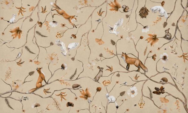 Une composition raffinée de renards, hérissons, chouettes et lapins entre des branches gracieuses et des feuilles d'automne sur un fond sable chaud. Les tons dorés et crème apportent une atmosphère rustique et conviviale à la vie.