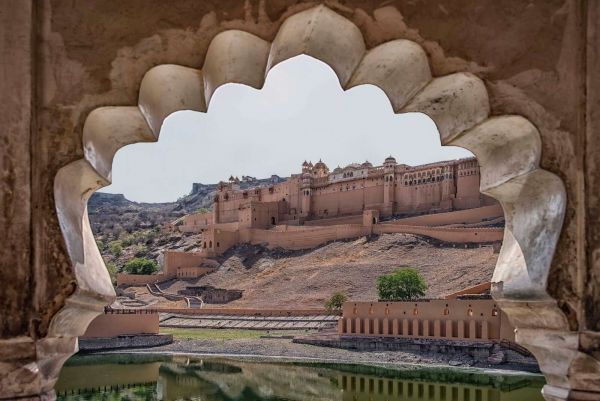 Un majestueux fort de couleur sable surgit d'un paysage désertique aride, encadré par des arcs gracieux et sculptés. La réflexion dans l'eau calme lui donne une allure sereine et imposante.