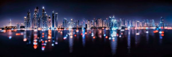 La composition des couleurs se compose de tons bleu froid et violet, alternant avec des reflets lumineux chauds en orange et rouge. Cette combinaison procure une sensation dynamique, énergique et moderne. Les lumières estompées au premier plan donnent à l'image une touche artistique, comme si vous regardiez la skyline à travers une lentille à mise au point douce — cela renforce l'aspect rêveur, presque futuriste.