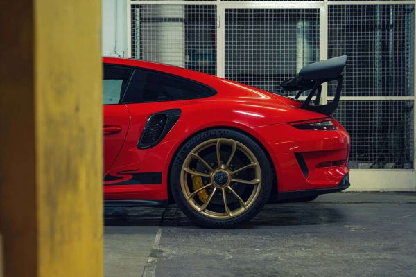 Un gros plan détaillé de la Porsche 911 GT3 RS, mettant en avant l'arrière avec le grand aileron et les jantes dorées. La peinture rouge et les détails aérodynamiques soulignent l'ADN de course pur de cette voiture de sport, prête à offrir puissance et vitesse.