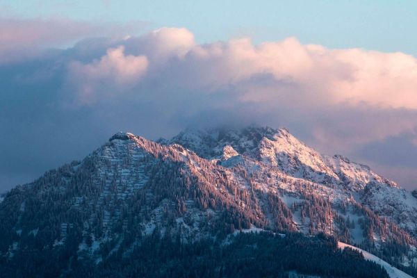 Un paysage montagneux majestueux enveloppé dans une douce lueur rose, avec des forêts de sapins enneigées et un ciel du soir rêveur. La lumière crée une atmosphère sereine, presque féerique, pleine de calme et de puissance.