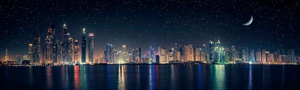 Une vue nocturne à couper le souffle sur une ligne d'horizon moderne pleine de reflets lumineux, sous un ciel étoilé scintillant avec une lune étroite. L'éclat coloré des gratte-ciel se reflète vivement dans l'eau calme.