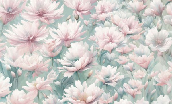 Un décor floral rêveur et raffiné avec des fleurs délicates dans des teintes douces de rose, de pêche et de crème. L'arrière-plan vert menthe frais donne au design une apparence légère et sereine, ce qui le rend parfait pour un intérieur romantique et apaisant.