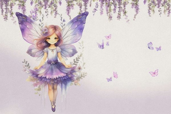 Un elfe rêveur avec des ailes violettes et une robe de fleurs flotte entre des papillons délicats et des grappes de fleurs dans des tons pastel doux. La combinaison de la structure aquarelle et de l'atmosphère féerique rend l'image aérienne et magique.
