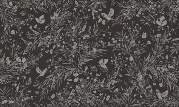 Un design enchanteur qui capture la tranquillité de la nature dans la nuit. Sur un fond noir profond se déploie un jeu délicat de lignes de fleurs, de feuilles et de petits oiseaux chanteurs, représentés dans des tons de gris doux avec des contrastes subtils de clair-obscur. Les rouges-gorges flottent à travers l'image ou se reposent sur les branches, entourés de marguerites, d'herbes, de fleurs des champs et de papillons. L'ensemble rappelle une ancienne gravure botanique avec une touche moderne. L'utilisation de couleurs monochromes crée une atmosphère discrète, presque poétique. Le style d'illustration détaillé confère au design richesse et profondeur, sans être écrasant. Le fond sombre confère au design une élégance et une finesse, laissant les lignes et les formes claires s'illuminer subtilement — comme si elles étaient baignées de clair de lune. Parfait pour un intérieur classique moderne ou un intérieur éclectique élégant avec profondeur et caractère. À combiner avec des matériaux tels que le velours, le bois foncé, le marbre ou le laiton pour une allure luxueuse. Également magnifique avec des meubles plus légers et des éléments naturels pour adoucir le contraste. Idéal pour une chambre à coucher, une bibliothèque, un hôtel-boutique, un hall chaleureux ou un environnement hôtelier intime. Le design respire la tranquillité, la classe et l'attachement à la nature, et est idéal comme mur d'accent avec une douce allure. Un hommage nocturne à la nature — serein, rêveur et d'une beauté intemporelle.