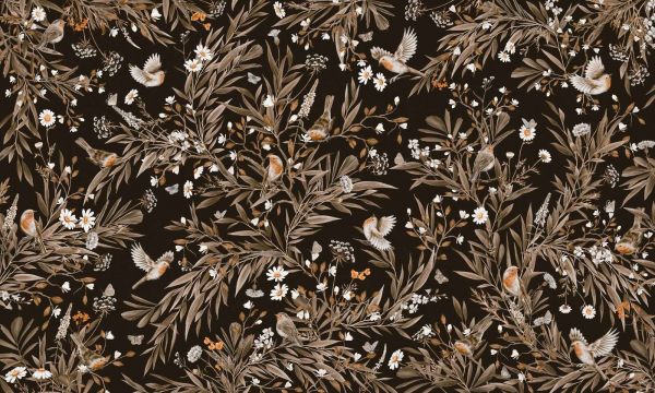 Une danse atmosphérique de rouge-gorges remplit ce tableau riche et détaillé. Sur un fond profond, presque noir, se déploient des branches luxuriantes avec de longues feuilles, de délicates fleurs et des marguerites blanches. Les couleurs sont délibérément atténuées : des nuances douces de brun et de beige, ponctuées d'accents blancs et de touches subtiles d'orange et de crème. Cette combinaison de couleurs discrète crée une ambiance harmonieuse et chaleureuse qui est à la fois apaisante et vivante. Ce design s'intègre parfaitement dans un style d'intérieur rural ou classique. Imaginez un salon avec des meubles en bois naturel, des rideaux en lin et des accessoires vintage - ce motif est un prolongement naturel d'un tel environnement. Également dans un cadre bohémien, combiné avec du rotin, du macramé et des textiles légers, le design prend vie magnifiquement. Les rouge-gorges ludiques apportent une subtile sensation de mouvement, tandis que la flore délicate maintient l'ensemble aéré. La répétition des motifs est rythmée mais pas trop stricte, ce qui lui confère une sensation organique et libre. En utilisant un fond sombre, les détails floraux plus clairs et les oiseaux ressortent encore plus, créant une élégante profondeur. Idéal pour les espaces où vous souhaitez apporter une touche naturelle : une chambre calme, un coin lecture confortable, un couloir chaleureux ou même un charmant espace de travail. Associez ce motif à des tons crème ou sable, des accessoires en laiton ou en bronze, et des bois chauds pour une allure équilibrée et intemporelle.