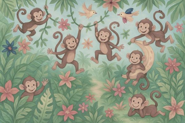 Papier Peint - Singes joyeux dans la jungle des fleurs.