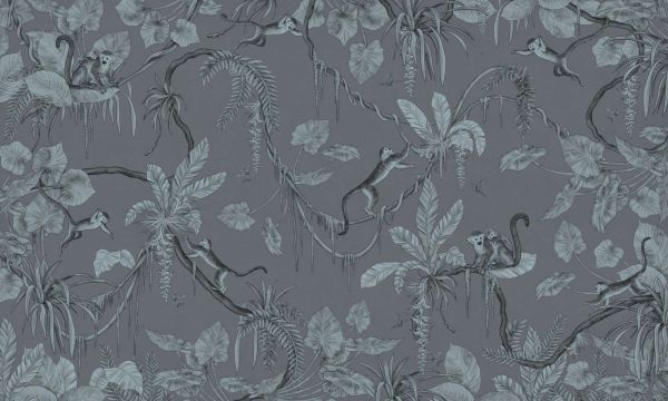 Les singes se balancent à travers un paysage tropical luxuriant, dessiné dans des tons bleu-gris élégants. L'arrière-plan calme et les couleurs douces donnent au design une ambiance jungle paisible et élégante avec des détails ludiques.