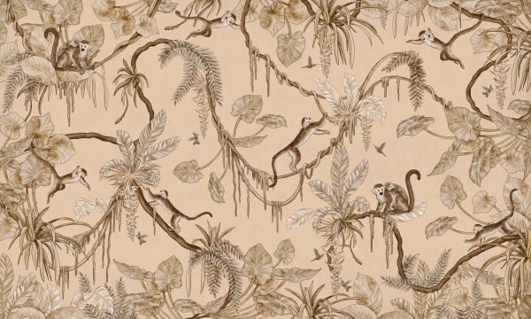 Petits singes jouent entre la canopée tropicale et les lianes, dessinés dans des tons bruns et beiges naturels. L'arrière-plan sable chaud apporte calme et élégance intemporelle à cette scène de jungle ludique.