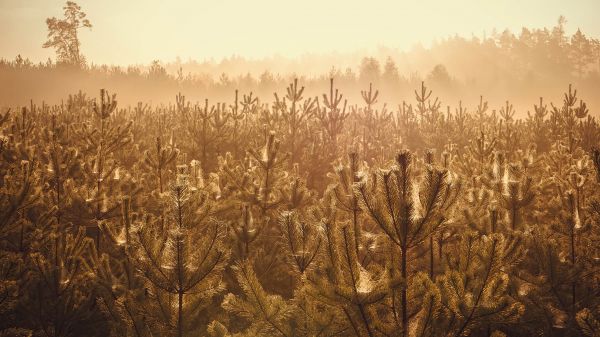Lever de soleil sur une jeune forêt de pins. La photo a été prise lors d'une belle matinée d'automne. Vous pouvez voir comment le soleil levant ajoute de la vie et réveille la nature après une nuit froide.