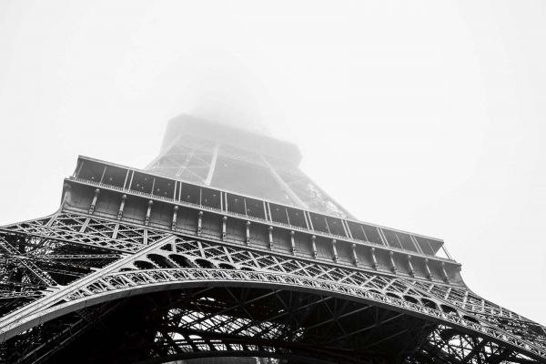 La tour Eiffel emblématique se dresse dans un épais brouillard, la pointe disparaissant complètement dans le ciel blanc. Le contraste noir et blanc met en valeur le jeu de lignes en fer et donne à l'image une atmosphère mystérieuse et cinématographique.